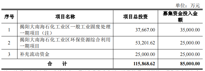 惠城环保9月11日披露2024年度向特定对象发行A股股票之募集说明书(申报稿)显示,本次向特定对象发行A股股票募集资金总额不超过85,000.00万元(含本数),在扣除发行费用后将应用于揭阳大南海石化工业区一般工业固废处理一期项目(注)、揭阳大南海石化工业区环保资源综合利用一期项目、补充流动资金。