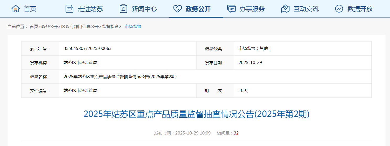 中国质量新闻网讯 据江苏省苏州市姑苏区人民政府网站消息,近日,苏州市姑苏区市场监管局发布2025年第2期重点产品质量监督抽查情况。本次抽查共抽查10个品类21批次产品,其中发现4批次不合格,17批次未发现不合格。
