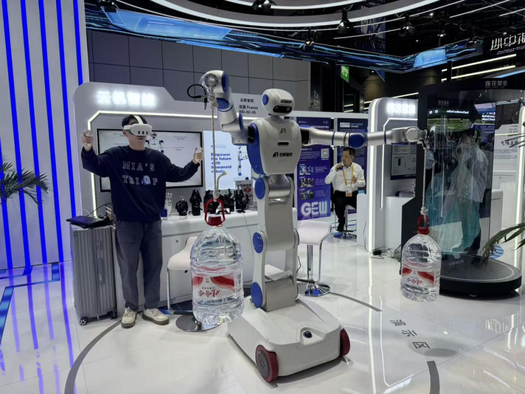 在可立克魔展台的不远处,另一个机器人手拎两桶5升的矿泉水,展现出其惊人的臂力。“我们是一家专注于机器人本体设计研发以及相关算法开发的公司。这款云帆智控机器人是我们最新研发的用于工业场景的机器人。它最大的特点在于大负载量以及长续航,它双臂协同能够达到30公斤的负载,底盘续航能力能达到6个小时以上。此外它的视觉识别精度能达到0.075毫米,机械臂的力感知精度能达到0.2牛米。”上海云帆智控机器人科技有限公司研发部经理余健介绍。