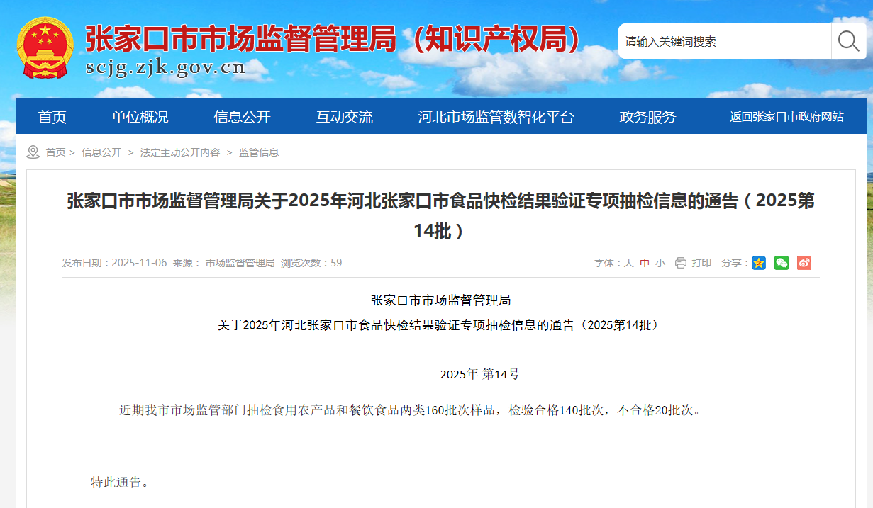近期我市市场监管部门抽检食用农产品和餐饮食品两类160批次样品,检验合格140批次,不合格20批次。
