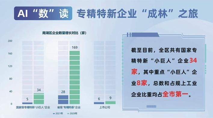 “十四五”期间,南湖区国家级专精特新“小巨人”企业从5家激增至34家,增长近6倍;省级专精特新企业从28家攀升至169家,增长超5倍,全区上市公司也从6家增长到9家。