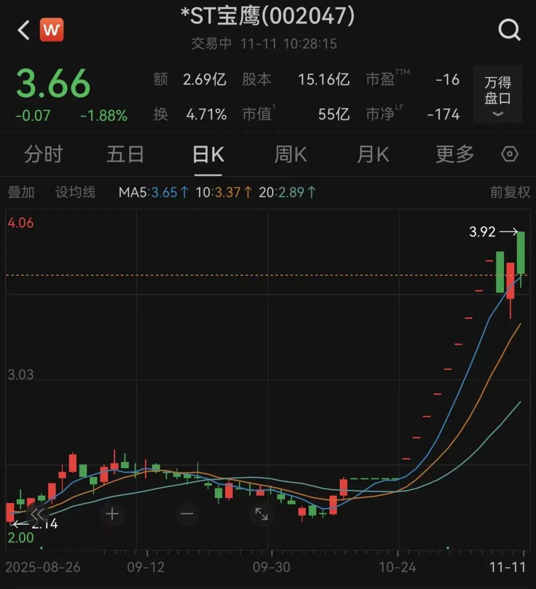 11月7日,建筑装饰行业公司*ST宝鹰再度发布股票交易异常波动公告。自10月27日因控制权拟变更事项复牌以来,公司股票一路上涨,连续9个交易日一字板涨停。11月10日,公司股价报收3.73元/股,较停牌前收盘价2.41元/股累计涨幅超54%。11月11日,公司股价下跌,截至发稿,报3.66元/股,跌1.88%,最新市值为55亿元。