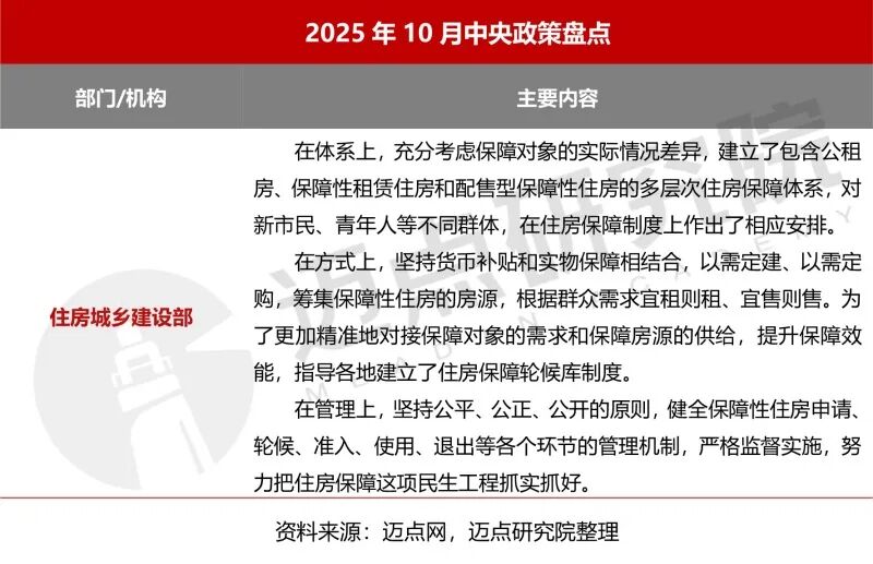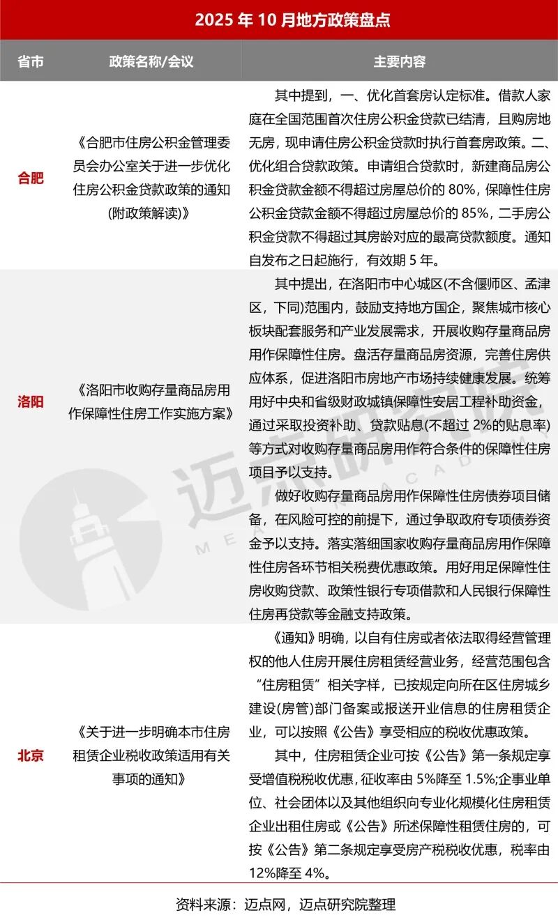 本月,地方政策呈现出“住房金融优化与存量资源盘活双轮驱动”的特点,重点聚焦于支持合理购房需求、扩大保障性住房供给以及促进租赁市场发展。其中:合肥调整首套房认定标准,明确组合贷款限制;洛阳推动收购存量商品房用作保障性住房;北京实施住房租赁企业税收优惠政策。