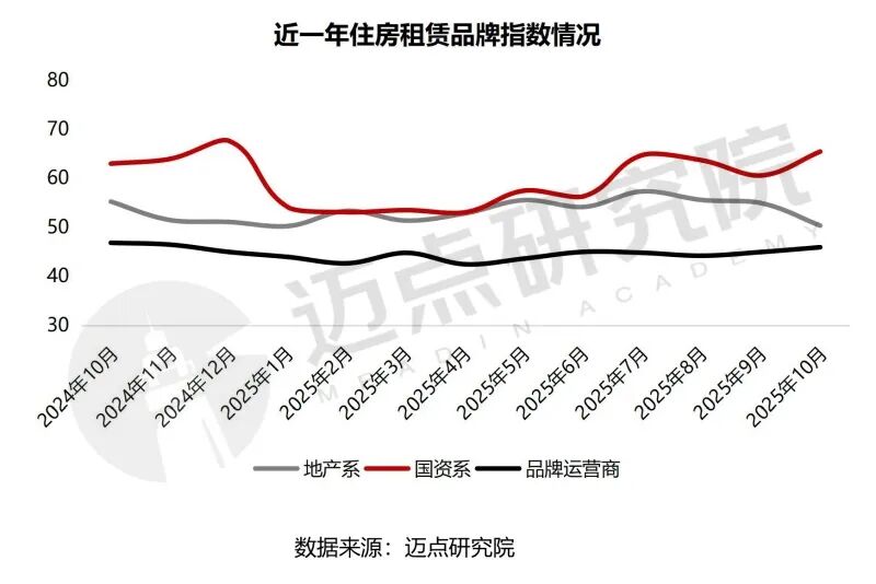 10月,全国住房租赁品牌指数环比上升2.4%至54.2。其中国资系品牌指数上涨明显(+8.0%),本月为65.4;地产系品牌指数下滑8.3%,为50.3;品牌运营商指数上升2.2%至45.9。