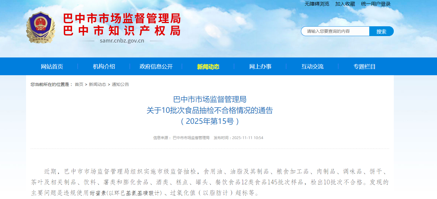 近期,巴中市市场监督管理局组织实施市级监督抽检,食用油、油脂及其制品、粮食加工品、肉制品、调味品、饼干、茶叶及相关制品、饮料、薯类和膨化食品、酒类、糕点、罐头、餐饮食品12类食品145批次样品,检出10批次不合格。发现的主要问题是违规使用甜蜜素(以环己基氨基磺酸计) 、过氧化值(以脂肪计)超标等。