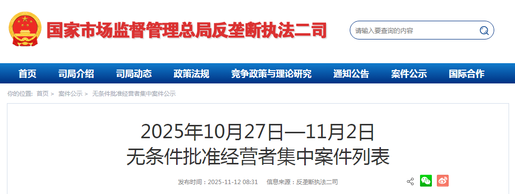 | 5 | 丰田通商(中国)有限公司收购新疆天汇汽车服务有限公司部分业务案 | 丰田通商(中国)有限公司,新疆天汇汽车服务有限公司部分业务 | 2025年10月27日 |