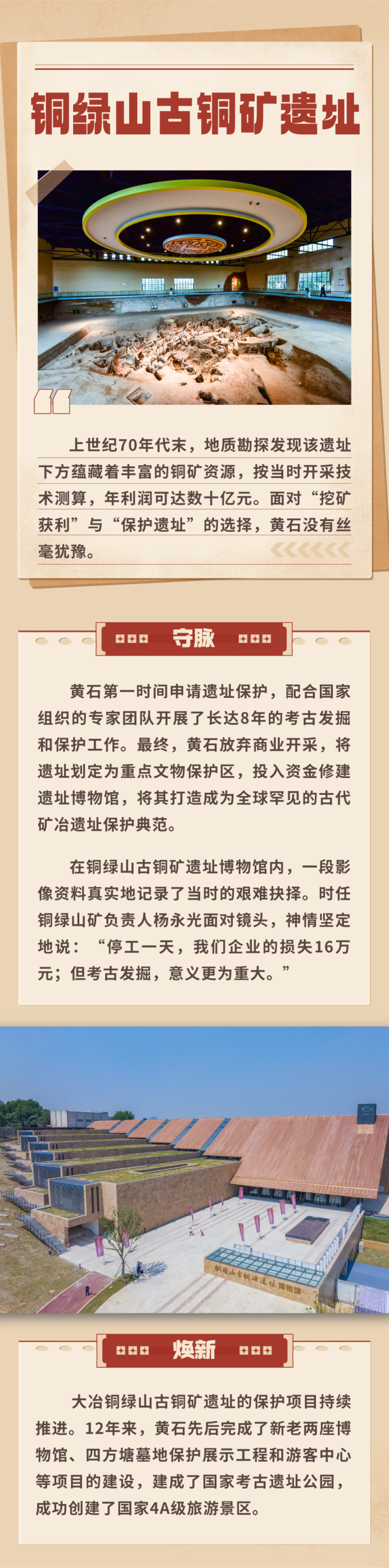 黄石现有8处全国重点文物保护单位,其中国家工业遗产3处(汉冶萍公司—大冶铁厂、铜绿山古铜矿遗址、华新水泥厂旧址)。2011年,省政府便专门批准设立 “湖北黄石工业遗产片区”,将铜绿山古铜矿遗址、大冶铁矿东露天采场、汉冶萍煤铁厂矿旧址、华新水泥厂旧址这四大核心遗产纳入片区统筹保护。