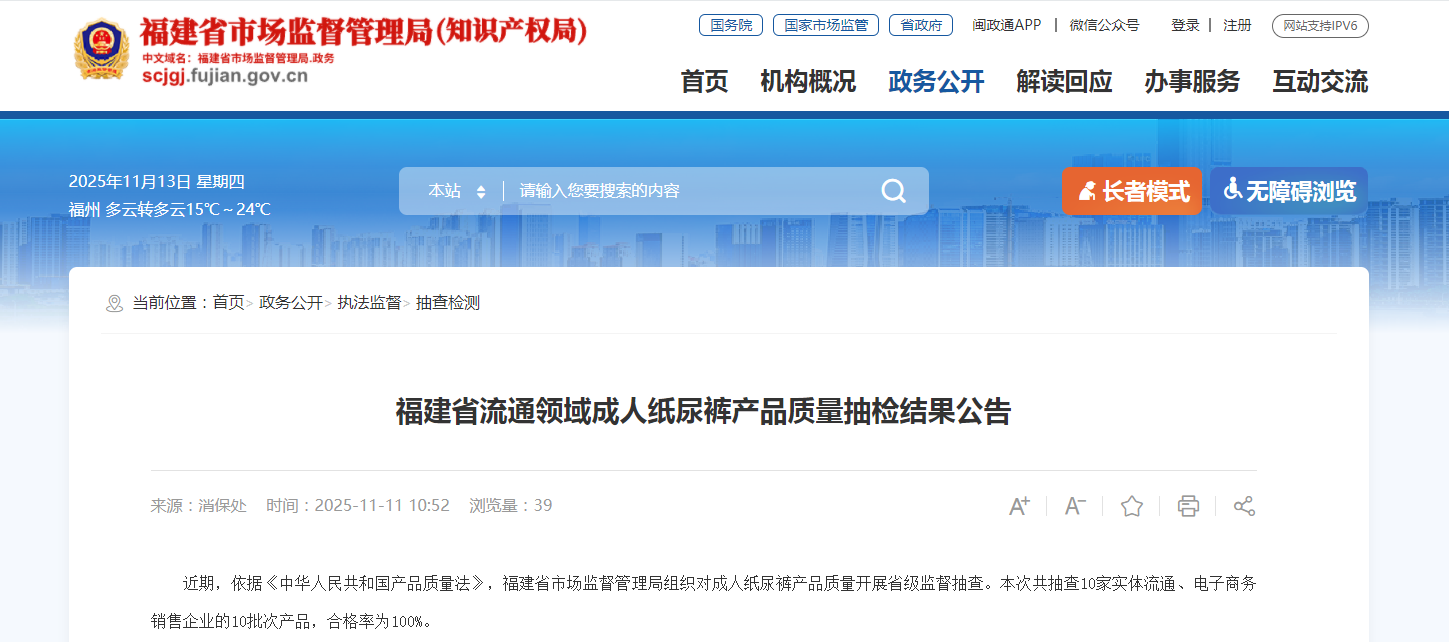福建省流通领域成人纸尿裤产品质量抽检结果公告