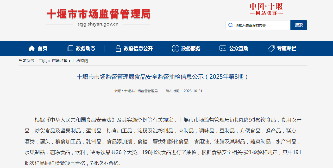 根据《中华人民共和国食品安全法》及其实施条例等有关规定,十堰市市场监督管理局近期组织对餐饮食品,食用农产品,炒货食品及坚果制品,蛋制品,粮食加工品,淀粉及淀粉制品,肉制品,调味品,豆制品,方便食品,蜂产品,糕点,酒类,罐头,粮食加工品,乳制品,食品添加剂,食糖,薯类和膨化食品,食用油、油脂及其制品,蔬菜制品,水产制品,水果制品,速冻食品,饮料,冷冻饮品共26个大类、198批次食品进行了抽检,根据食品安全相关标准检验和判定,其中191批次样品抽样检验项目合格,7批次不合格。