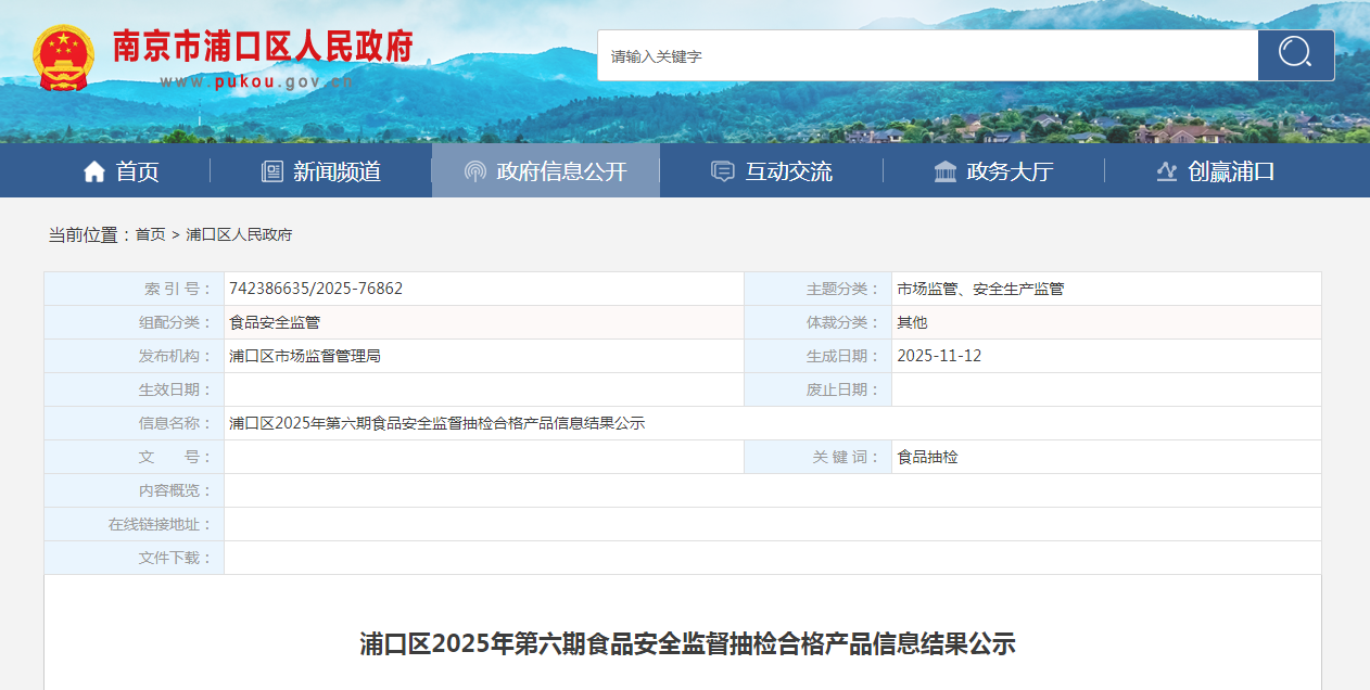 浦口区2025年第六期食品安全监督抽检合格产品信息结果公示