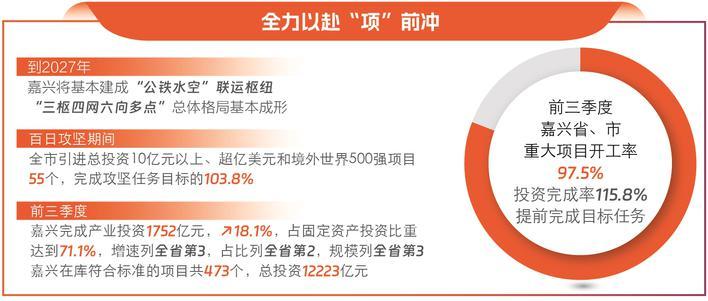 嘉兴南湖机场准备就绪,静待起飞;嘉兴市中医医院医技住院综合楼项目主体封顶,加速推进;以微短剧、音乐创作为代表的大视听产业增速空前,串点成链……今年初以来,嘉兴全市上下以重大项目为抓手,全力以赴“项”前冲,前三季度,嘉兴省、市重大项目开工率97.5%,投资完成率115.8%、提前完成目标任务。
