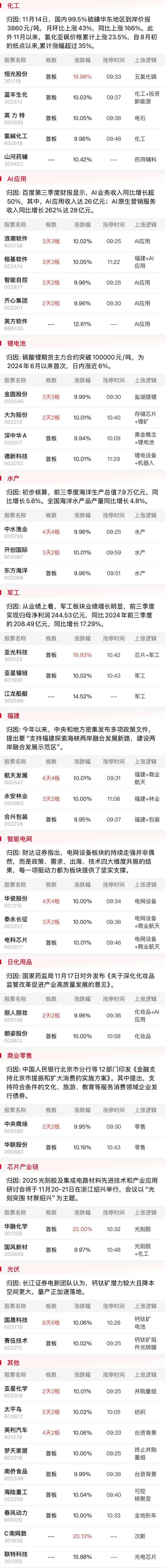 化工板块局部活跃,华融化学、恒光股份、蓝丰生化、氯碱化工、国风新材等涨停。消息面上,11月14日,国内99.5%硫磺华东地区到岸价报3860元/吨,月环比上涨43%,同比上涨166%。此外11月以来,氯化亚砜价格累计上涨23.5%,自8月初的低点以来,累计涨幅超过35%。