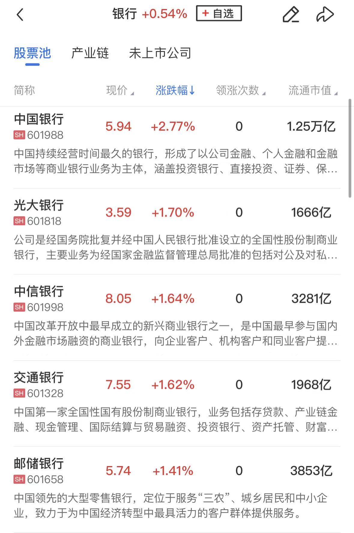 板块上,银行板块走强,中国银行涨近3%创历史新高,光大银行、中信银行、交通银行、邮储银行涨幅居前。