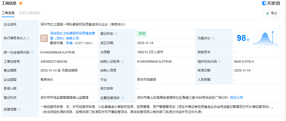 投资界(ID:pedaily2012)11月19日消息,据天眼查信息显示,深圳市红土星舰一号私募股权投资基金合伙企业(有限合伙)注册成立,出资额约16.8亿元人民币,经营范围为以私募基金从事股权投资、投资管理、资产管理等活动。