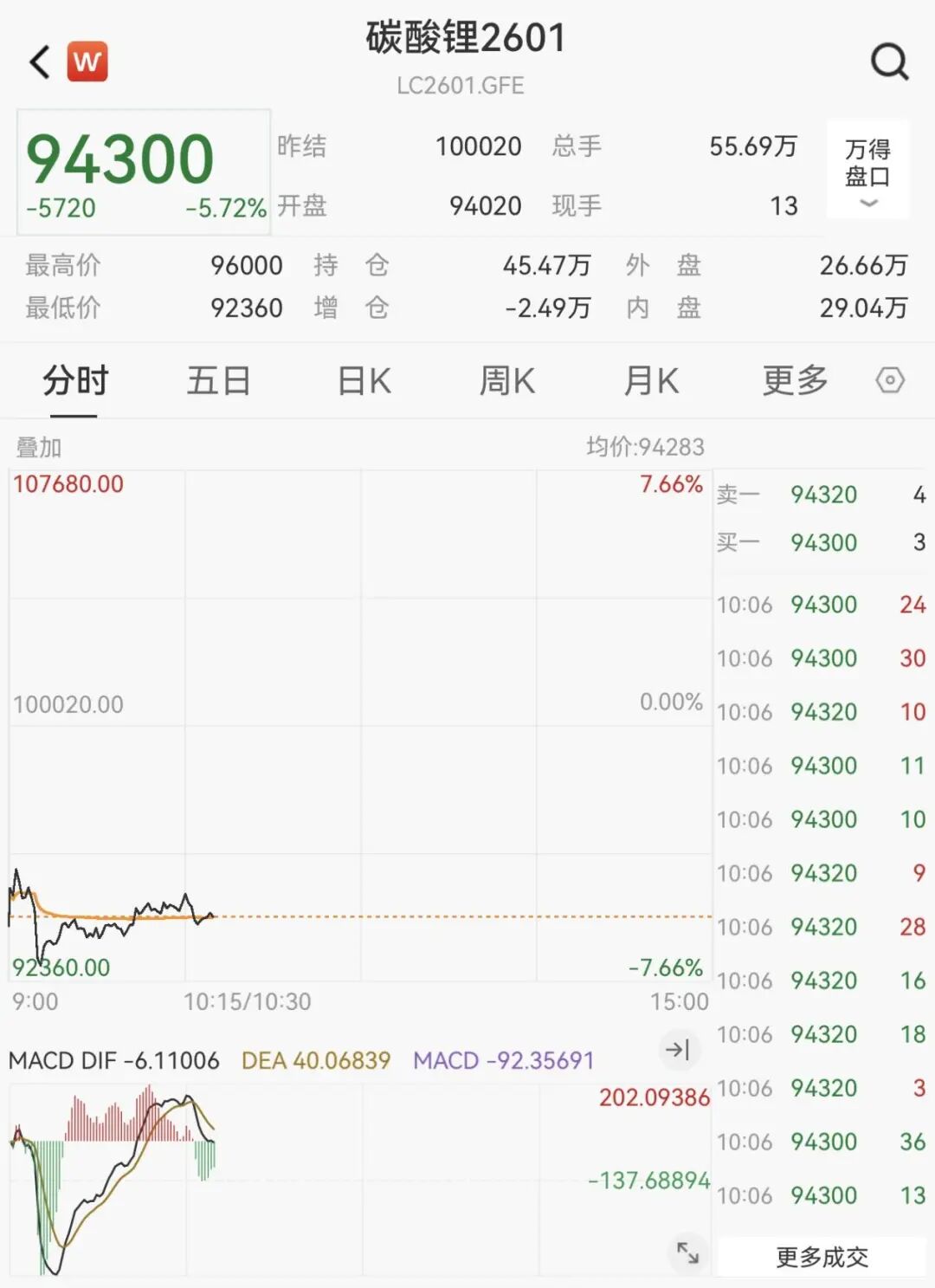 广期所碳酸锂主力合约盘中一度跌超7%。消息面上,11月20日,广期所调整碳酸锂期货相关合约交易手续费标准及交易限额。