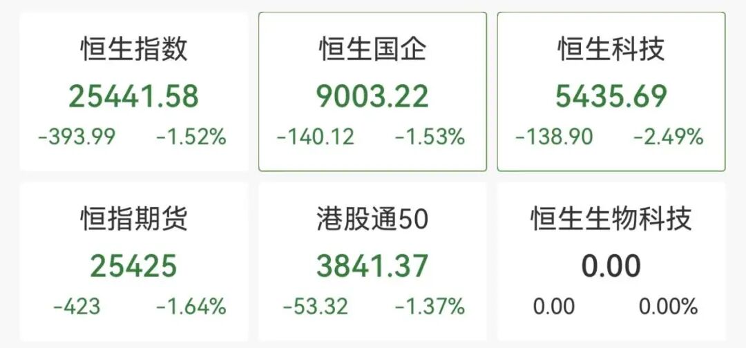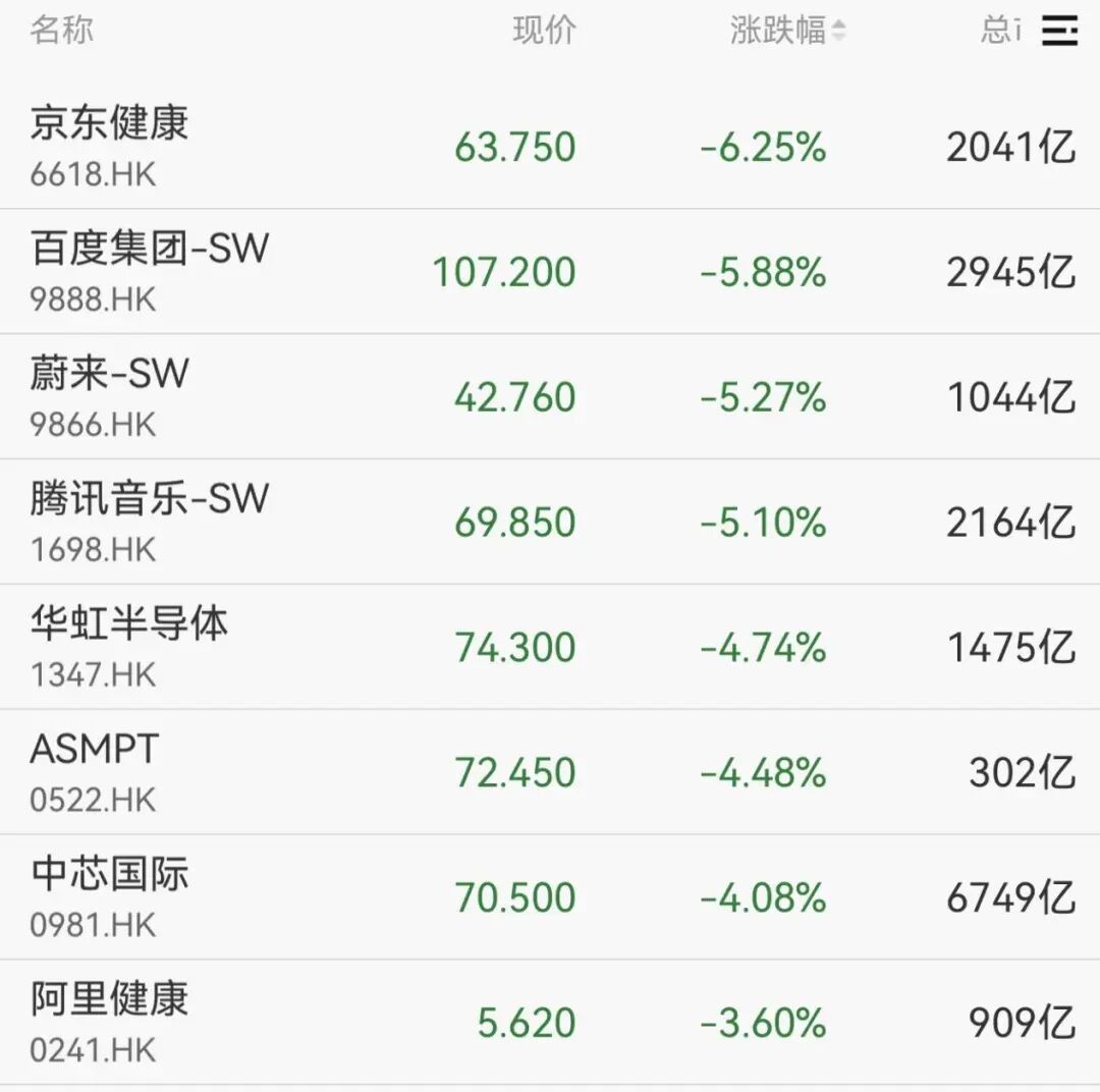 港股恒生科技指数跌超2%,京东健康、百度集团、蔚来均跌超5%。