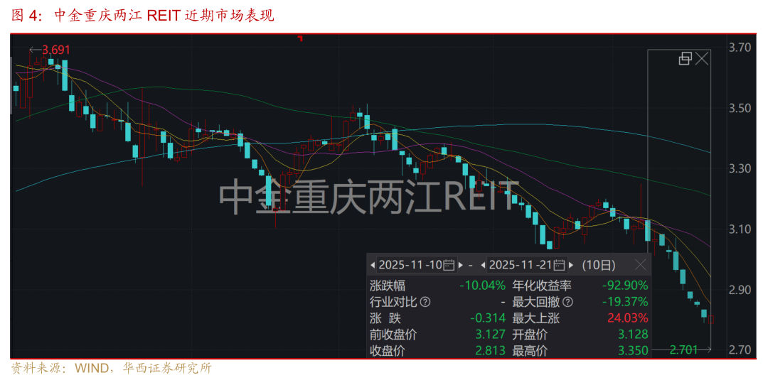 中金重庆两江REIT本周继续下跌,近两周合计跌幅约10%,预测是受12月即将解禁31%份额的影响,可关注超跌机会。项目底层资产为位于重庆市两江新区两江数字经济产业园照母山研创核心区内的双鱼座、双子座、凤凰座项目及拓D一期D2项目,2025年以来三个季度末的出租率分别为90.00%、88.11%、87.81%,出租率及单价均呈现一定的下降趋势,部分租户存在未及时缴纳租金情况。但近期根据重庆市政府公告,重庆市撤销江北区、渝北区,设立两江新区,两江新区“升级”为行政区,调整后两江新区继续保持经济开发建设的首位度和优先级。此外,中金重庆两江已设置收益分配调节机制,分红有一定的保障度,目前项目分派率约4.85%。
