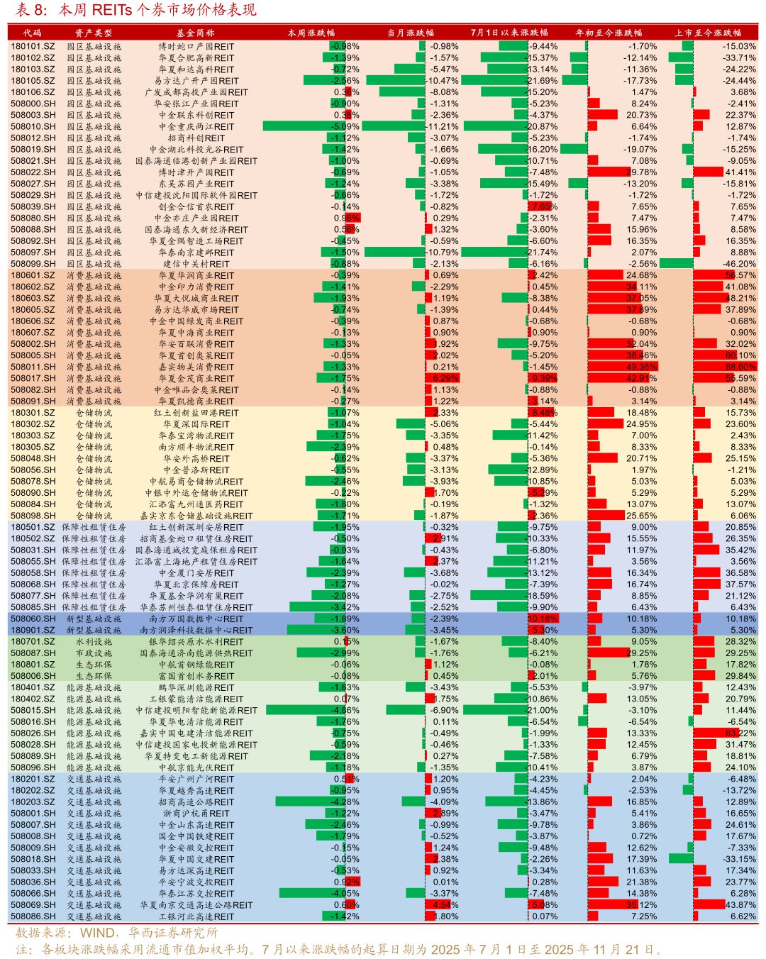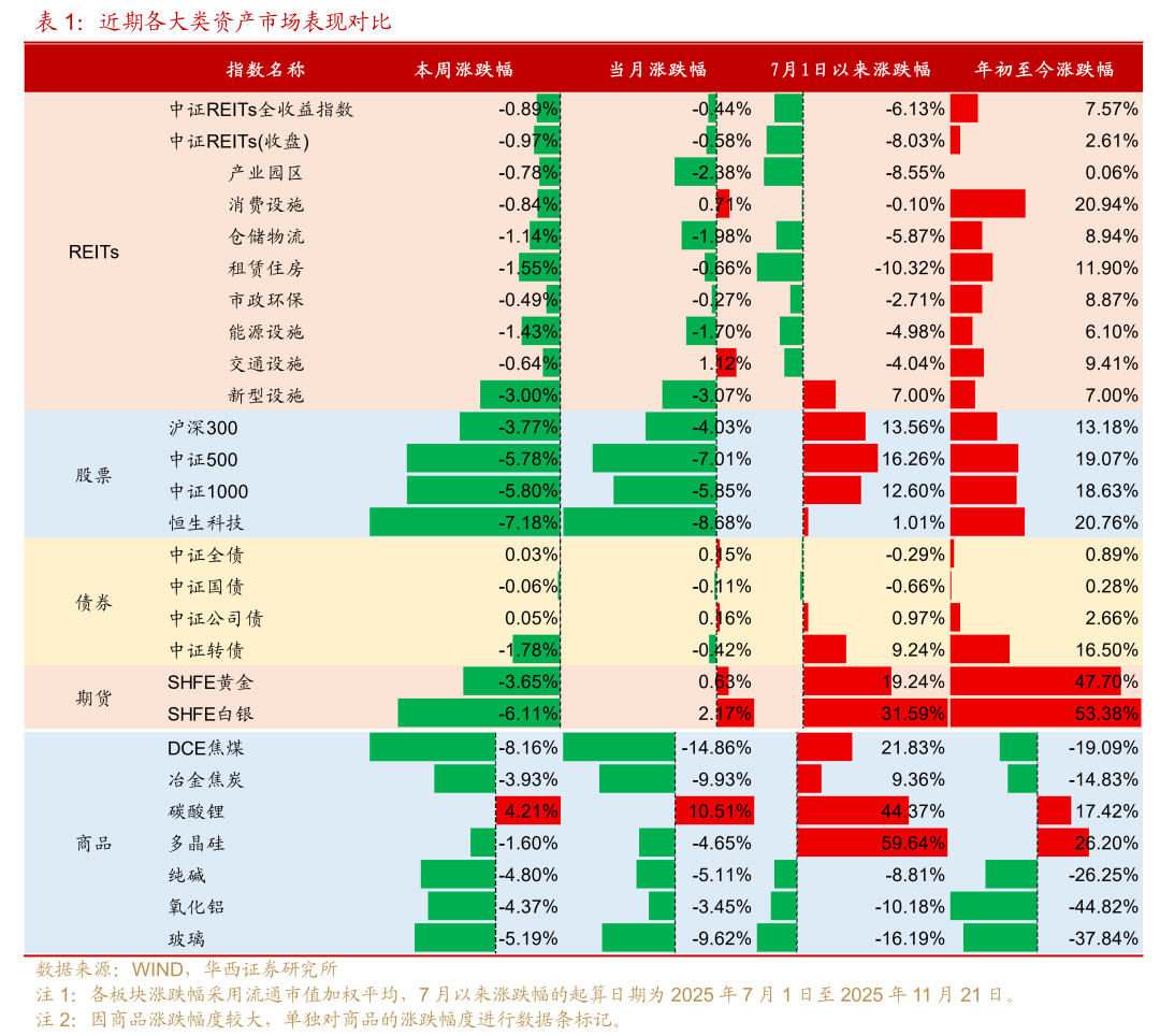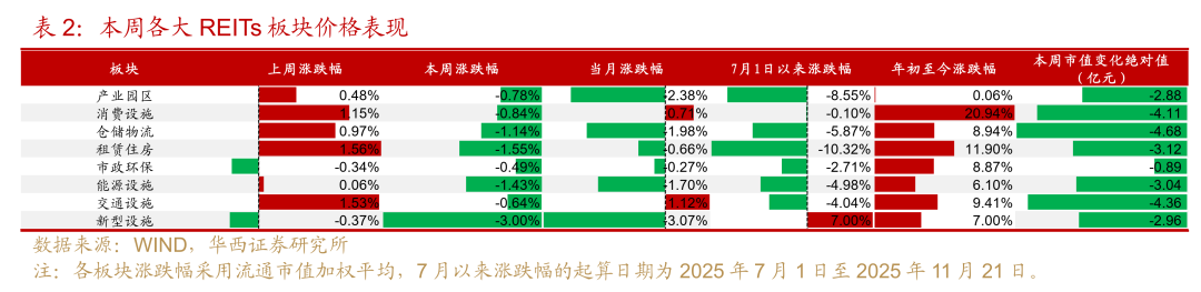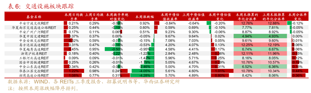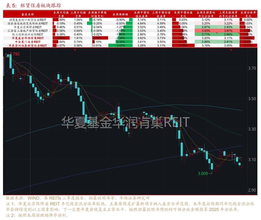 租赁住房板块:本周全部个券收跌,目前板块分派率已从6月底的2.83%提升至3.14%,项目基本面经营正常,每逢大幅度的调整后即是较好的配置窗口。受扩募采用配售方式影响,华润有巢近期调整幅度很大,11月前三周的每周日均换手率分别达到2.0%、1.8%和2.6%,可关注扩募配售进度及配置机会。此外,需关注扩募审核中的厦门安居后续发售方式。