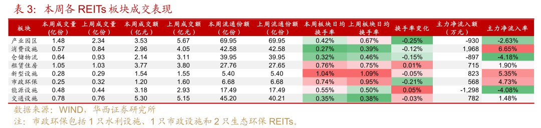 分板块来看,本周新型设施、租赁住房、市政环保换手率领先。新型设施本周跌幅最大,日均换手率近两周保持在1%以上。消费设施板块的日均换手率最低仅0.27%,但主力净流入率达6.65%,仍值得考虑消费板块中分派率较高或近期跌幅较大的个券。