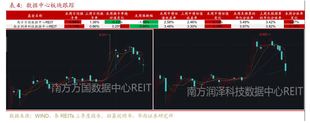 数据中心板块:本周润泽科技数据中心跌幅达3.6%,万国数据中心也下跌近2%。两只数据中心REITs的签约客户单一,租约较长,现金流对客户依赖度很高,但客户为我国三大电信运营商,可靠性强。本周下跌后润泽科技数据中心分派率又回至4%左右,主力资金仍有净流入,在权益板块科技行情起势后可继续关注。