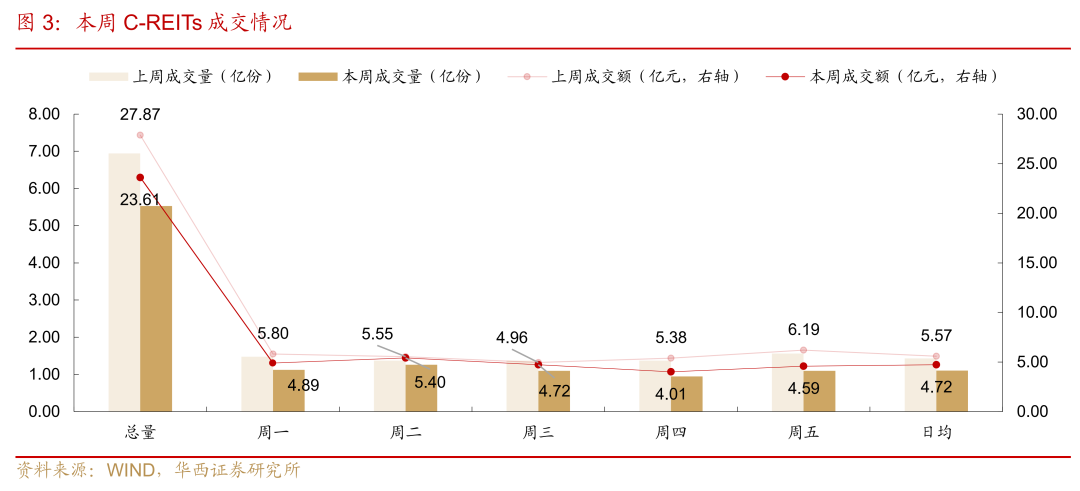 本周REITs成交活跃度环比走弱,日均成交额4.72亿元、日均成交量1.11亿份、日均换手率0.43%(未考虑近两周新上市项目),环比分别下降15.28%、22.70%、0.12pct。