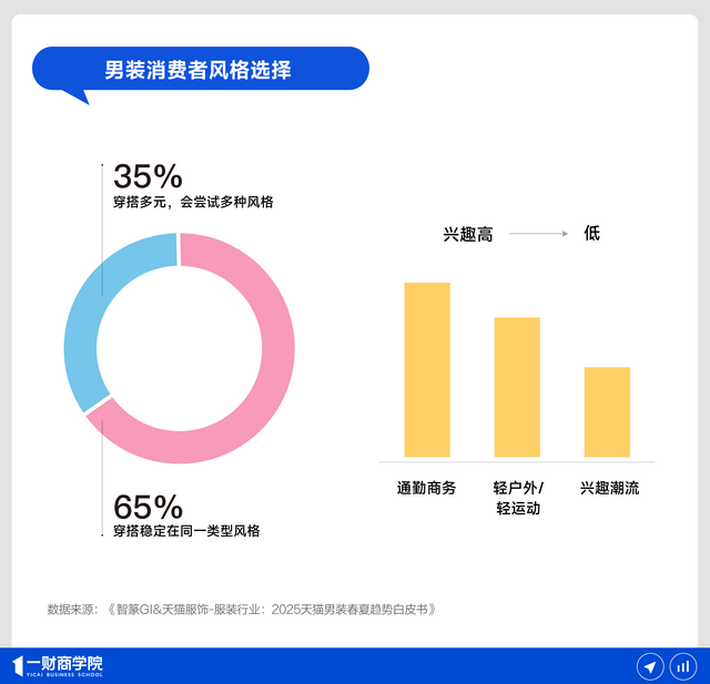 智篆GI&天猫服饰发布的《智篆GI&天猫服饰-服装行业:2025天猫男装春夏趋势白皮书》显示,2025年,65%的男性消费者认为自己的穿搭会稳定在某一特定类型的风格中。具体风格来看,男性对通勤商务风格的喜好度最高,其次是轻户外/轻运动和兴趣潮流。