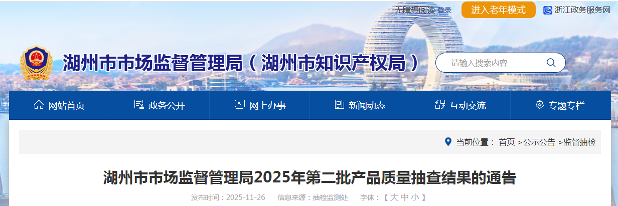 中国质量新闻网讯 据浙江省湖州市市场监督管理局网站消息,为加强产品质量监管,保障公众身体健康和生命安全,湖州市市场监督管理局组织开展了辖区内工业产品生产、销售单位的监督抽查,现将本年度第二批抽检结果予以公告,详见附件。