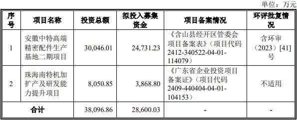 南特科技本次发行募集资金总额为322,007,629.14元,扣除发行费用后,募集资金净额为284,425,173.62元。南特科技于2025年11月7日披露的招股说明书显示,该公司拟募集资金28,600.03万元,分别用于安徽中特高端精密配件生产基地二期项目、珠海南特机加扩产及研发能力提升项目。