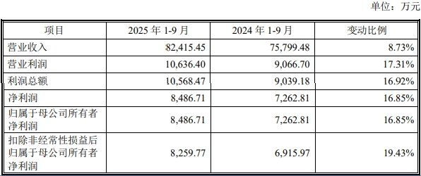 2025年1-9月,南特科技实现营业收入82,415.45万元,同比增长8.73%;实现归属于母公司所有者净利润8,486.71万元,同比增长16.85%;实现扣除非经常性损益后归属于母公司所有者净利润8,259.77万元,同比增长19.43%;经营活动产生的现金流量净额为-9,609.36万元,上年同期为4,756.16万元。