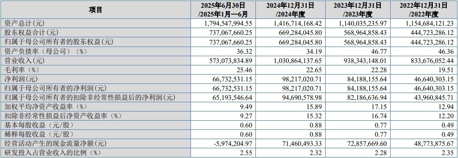 2022-2024年度及2025年1-6月,南特科技的营业收入分别为83,367.61万元、93,834.31万元、103,086.41万元和57,307.38万元,实现净利润/归属于母公司所有者的净利润分别为4,664.03万元、8,418.82万元、9,821.70万元和6,673.25万元,归属于母公司所有者的扣除非经常性损益后的净利润分别为4,396.08万元、8,218.66万元、9,469.06万元及6,519.35万元。