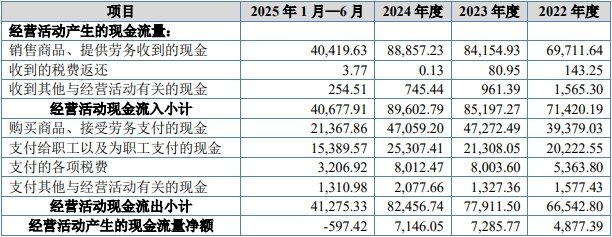 2022-2024年度及2025年1-6月,南特科技经营活动产生的现金流量净额分别为4,877.39万元、7,285.77万元、7,146.05万元及-597.42万元,销售商品、提供劳务收到的现金分别为69,711.64万元、84,154.93万元、88,857.23万元和40,419.63万元。