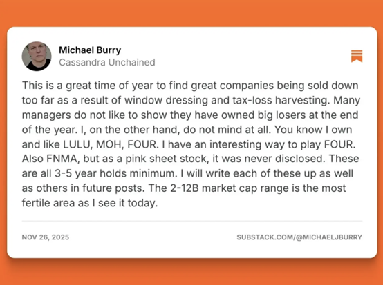 Burry还表示,现在“是一年中绝佳的捡漏时机,不少优质公司会因(基金公司)粉饰报表(window dressing)和税损收割(tax-loss harvesting)遭到过度抛售。”他解释称,“许多基金经理不愿在年末让人知道自己持有大幅下跌的标的,而我对此毫不在意。”