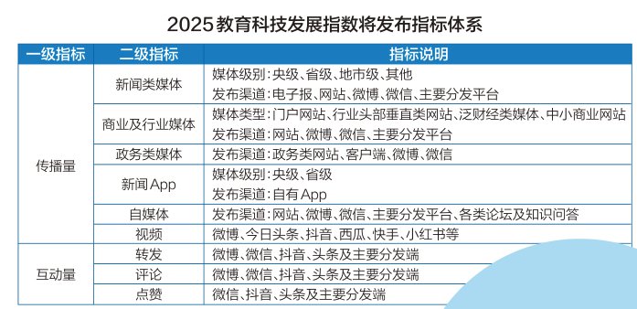 “2025教育科技行业发展指数”将以教育科技企业舆情的传播量及互动量为统计基础,同时考虑不同媒体渠道、发布者传播影响力、传播速度等因素,综合设定多级维度后加权计算得出。