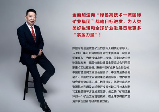 陈景河的奋斗生涯,也是一部中国矿业波澜壮阔的奋斗史。自1993年以来,陈景河担任紫金矿业的主要领导、董事长。他带领团队确立了“开发矿业,造福社会”的宗旨,提出了“绿色高技术超一流国际矿业集团”的战略目标。