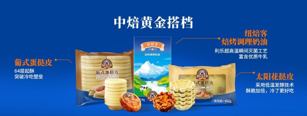 中焙黄金搭档,是中焙挞皮(64层葡式蛋挞皮、太阳花挞皮和墨鱼汁太阳花挞皮等)+纽焙客调理奶油的组合产品,被超70%中高端连锁烘焙饼店选择。它们不仅解决了门店“品质不稳定、冷了就不酥脆”的痛点,还拓宽了蛋挞的消费场景:不仅陈列面变大,也方便消费者可带回家随时享用;还给蛋挞带来更大的延展空间,让门店放心把创意发挥在产品差异化上,不用担心品质波动;品质和创意的结合,让蛋挞拥有了不同节日款、限量款的可能,也拥有了传播的基础。好利来用它实现蛋挞从热酥柜转为常温柜售卖的方式,销量翻倍;鲍师傅靠它推出的“火星挞”成了社交平台的网红款,热评不断;截至2025年8月,尚普咨询集团的调研直接给出答案:中焙在连锁烘焙门店蛋挞皮蛋挞液供应链市场占有率第一。