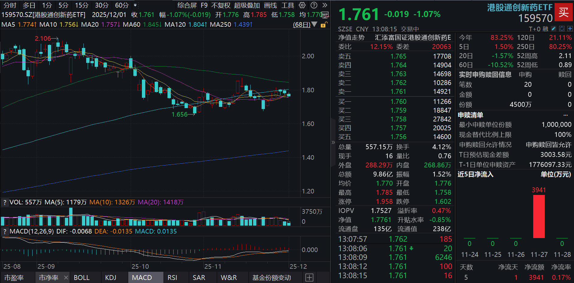 今日(12.1),港药再度回调,创新药纯度100%的港股通创新药ETF(159570)回调超1%,连续第二日下跌,成交额快速突破10亿元!资金面上,盘中获8000万元净流入,近10日累计“吸金”超8亿元!截至11月29日,港股通创新药ETF(159570)最新规模超240亿元,同类持续领先!