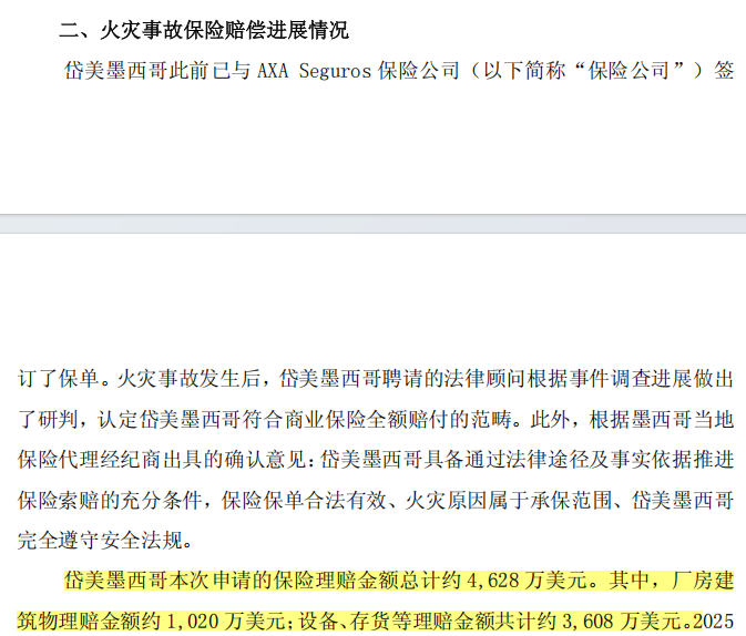 此前,岱美墨西哥一处厂房在墨西哥当地时间2025年5月11日下午发生意外火灾事故,所幸该事故发生于周末非生产时段,未造成人员伤亡及重大客户断供。