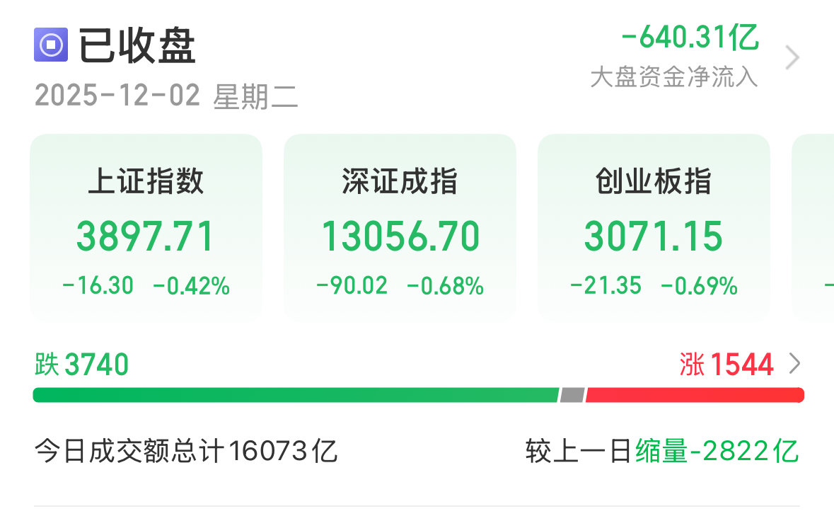 12月2日,A股三大指数集体调整,截至收盘,上证指数跌0.42%,收报3897.71点;深证成指跌0.68%,收报13056.70点;创业板指跌0.69%,收报3071.15点。