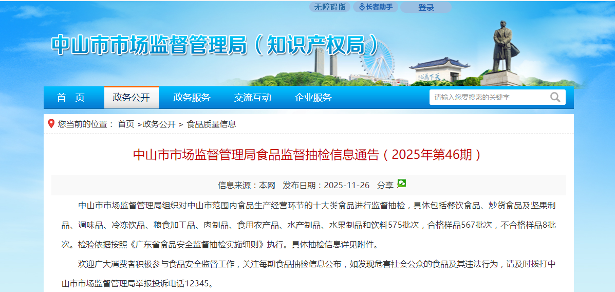 中山市市场监督管理局组织对中山市范围内食品生产经营环节的十大类食品进行监督抽检,具体包括餐饮食品、炒货食品及坚果制品、调味品、冷冻饮品、粮食加工品、肉制品、食用农产品、水产制品、水果制品和饮料575批次,合格样品567批次,不合格样品8批次。检验依据按照《广东省食品安全监督抽检实施细则》执行。具体抽检信息详见附件。