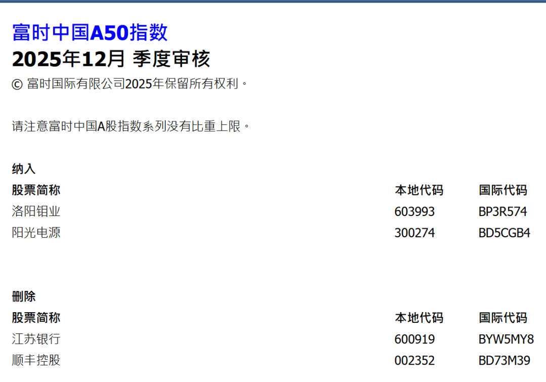 此次调整中,富时中国A50指数将洛阳钼业和阳光电源纳入,同时剔除江苏银行和顺丰控股。