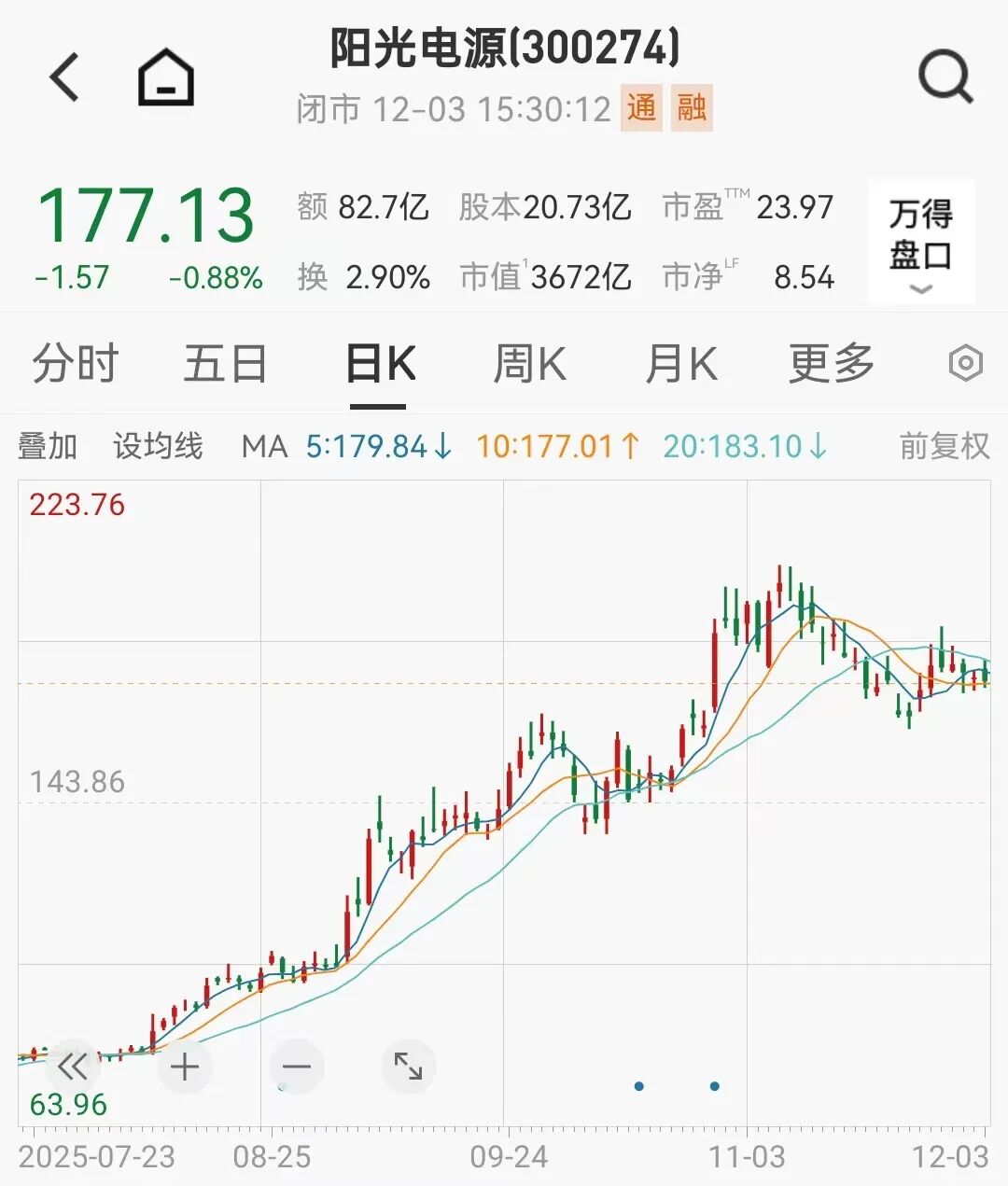 而阳光电源作为储能行业的龙头,7月以来的涨幅更是一度超过200%。截至12月3日收盘,阳光电源总市值为3672亿元。