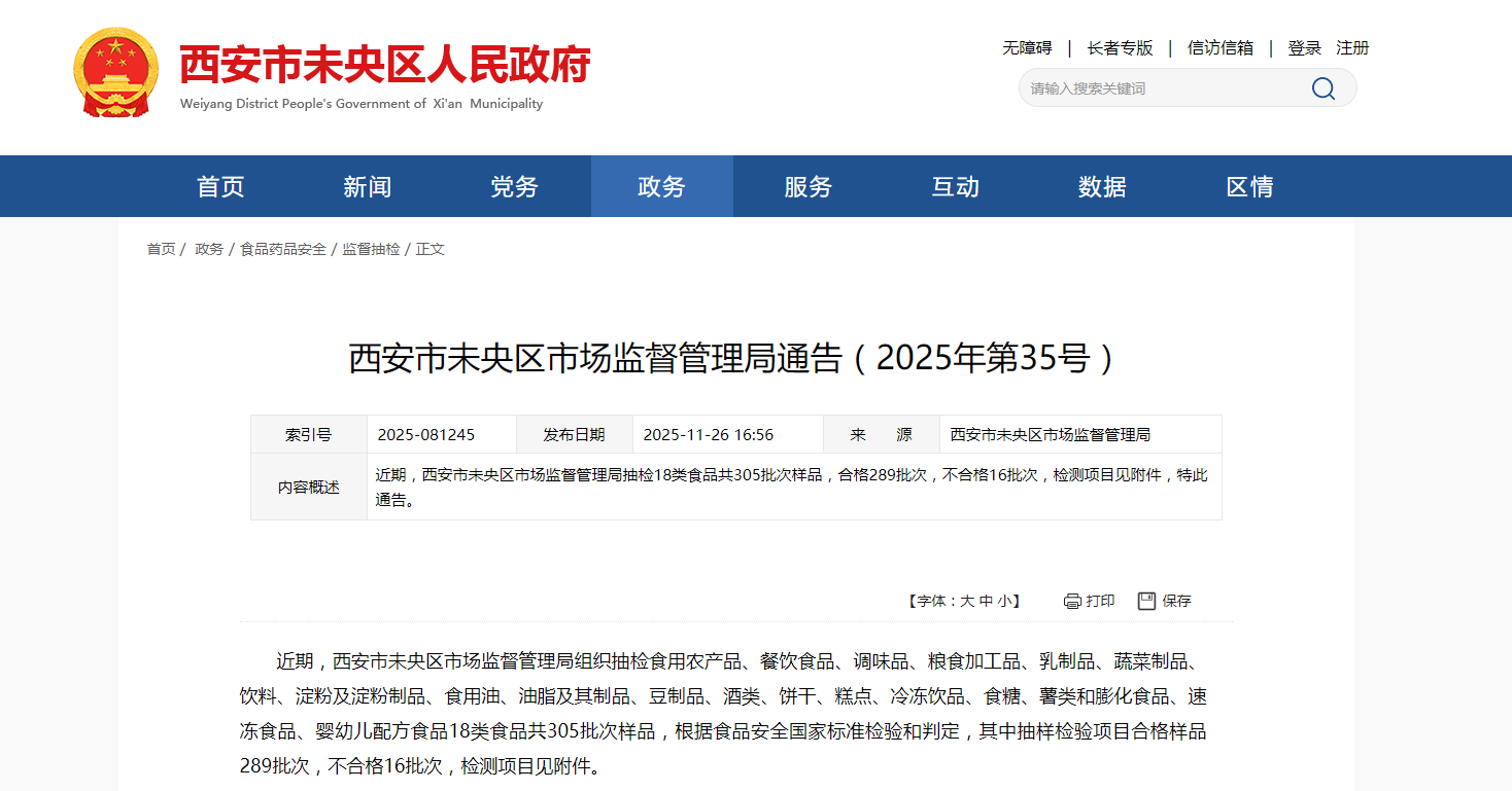 近期,西安市未央区市场监督管理局组织抽检食用农产品、餐饮食品、调味品、粮食加工品、乳制品、蔬菜制品、饮料、淀粉及淀粉制品、食用油、油脂及其制品、豆制品、酒类、饼干、糕点、冷冻饮品、食糖、薯类和膨化食品、速冻食品、婴幼儿配方食品18类食品共305批次样品,根据食品安全国家标准检验和判定,其中抽样检验项目合格样品289批次,不合格16批次,检测项目见附件。