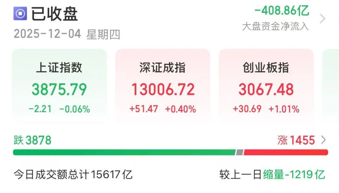 12月4日,A股三大指数涨跌互现。截至收盘,上证指数跌0.06%,深证成指涨0.40%,创业板指涨1.01%。全市场成交额15617亿元。