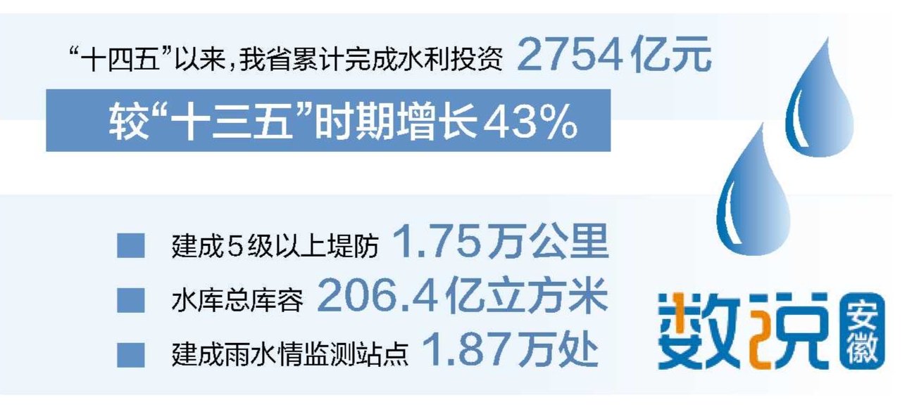 安徽襟江带淮、水系发达。“十四五”期间,我省水利建设投资连创新高,现代水网体系初步构建,水旱灾害防御能力大幅提升,农村供水保障持续加强,水资源节约集约利用成效显著,河湖水生态环境全面改善,水利高质量发展交出亮眼答卷。