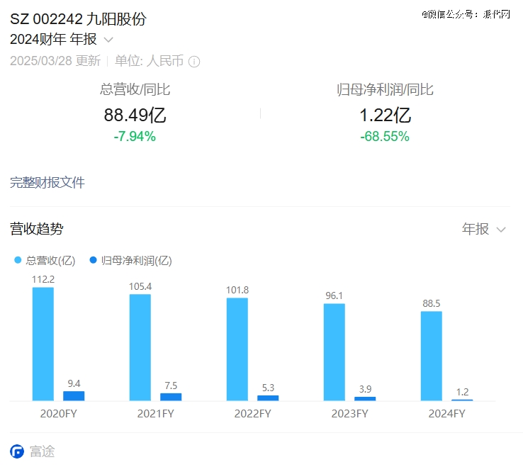 根据九阳豆浆的财报,2024年其营收为88.49亿元,同比下滑8%;净利润为1.22亿元,同比下降68.55%。虽然保持盈利,但在如今的饮品江湖,这个成绩单显得有些尴尬。