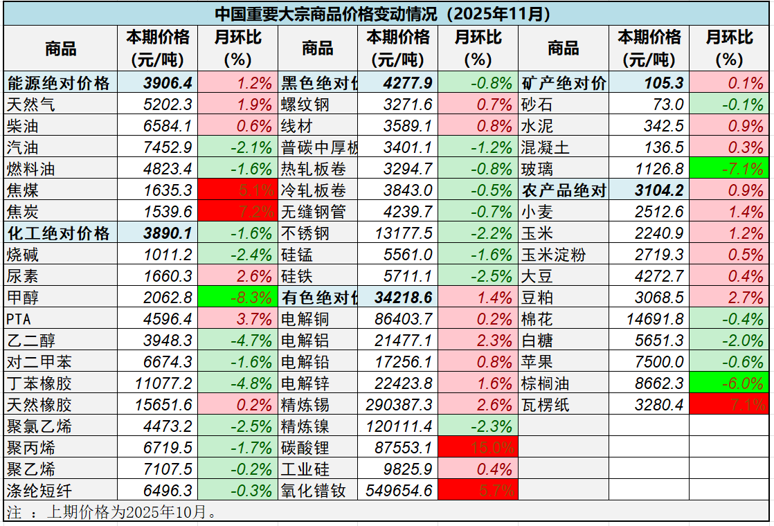 分商品看,在中国物流与采购联合会重点监测的50种大宗商品中,11月价格与上月相比,25种大宗商品价格上涨,25种大宗商品价格下跌。涨幅前三的大宗商品为碳酸锂、焦炭和瓦楞纸,环比分别上涨15%、7.2%和7.1%;跌幅前三的为甲醇、玻璃和棕榈油,环比分别下跌8.3%、7.1%和6%。