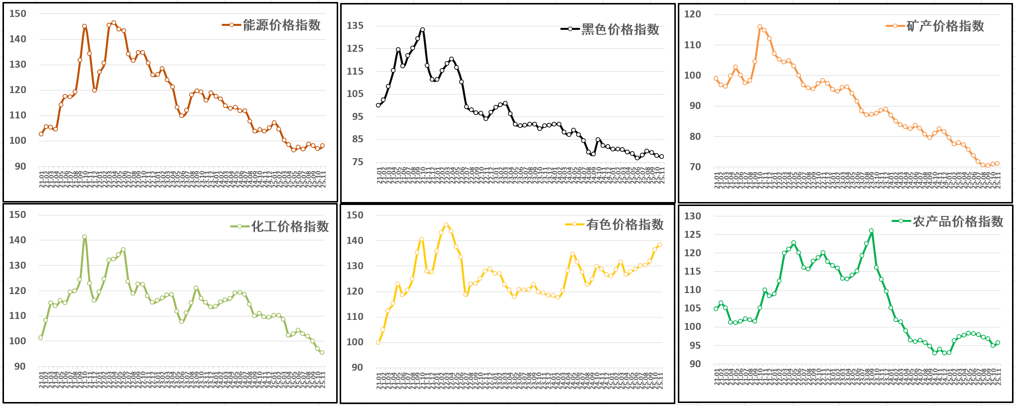 11月,黑色价格指数跌幅收窄,报77.2点,环比下跌0.8%,同比下跌6.1%;化工价格指数继续下行,报95.4点,环比下跌1.6%,同比下跌13%。