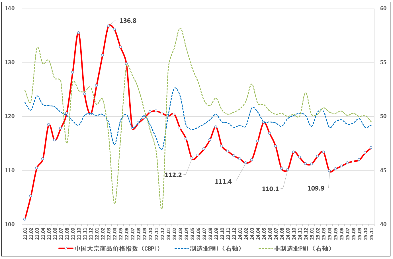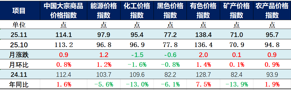 分行业看,得益于全球新能源产业快速发展,以及国内高技术制造业持续保持扩张,有色金属价格指数继续走高,报138.4点,环比上涨1.4%,同比上涨7.5%。受冬季取暖需求季节性增长,以及部分农产品供应偏紧等影响,能源价格指数和农产品价格指数止跌反弹,能源价格指数报97.9点,环比上涨1.2%,同比下跌5.6%;农产品价格指数报95.7点,环比上涨0.9%,同比上涨1.9%。