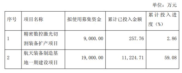 2020年7月,上海沪工发行4亿元可转换公司债券,用于“精密数控激光切割装备扩产项目”(以下简称数控激光项目)和“航天装备项目”。按最初计划,上海沪工拟向两个项目各投资9000万元和1.9亿元,另有1.2亿元用于补充流动资金。