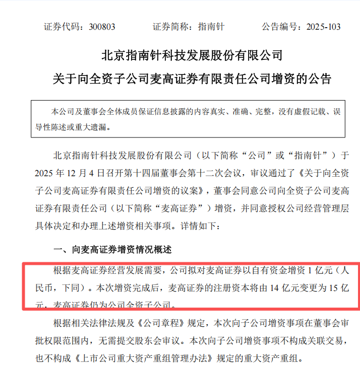 12月4日,指南针发布公告,公司拟向全资子公司麦高证券增资1亿元,增资完成后,麦高证券的注册资本将由14亿元变更为15亿元。
